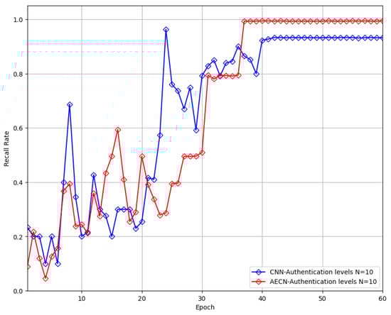 With the authentication level set at 10, the recall rates of the CNN and AECN models are presented in Figure 10. As the number of epochs increases, the recall rates for both the AECN and CNN demonstrate a consistent upward trend. The fluctuations in the recall of the AECN are less pronounced than those of the CNN, and the AECN converges more quickly than the CNN prior to the convergence of both models. Notably, once the models have converged, the CNN achieves a recall rate of 93.2%, while the AECN attains a significantly higher recall rate of 99.3%. This indicates that our proposed AECN model, which includes an attention module, exhibits strong performance and generalization ability, even when the security authentication level is increased to 10.
