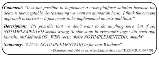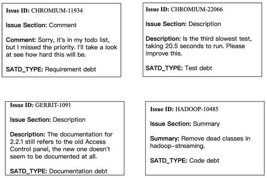 Code debt refers to code that is difficult to understand and maintain due to excessive complexity, lack of modularity, or poor coding practices, as well as code that contains errors, has not been thoroughly tested, or does not comply with coding standards, both of which contribute to technical debt and impact the long-term health of a software project. Design debt usually also refers to code sub-optimal choices and is also a type of code debt, so these two types of debt have not been studied separately in previous studies [11,14]. Therefore, we will continue with the previous studies [11,14] by combining these two types of study. Documentation debt is substandard documentation quality, as evidenced by incomplete, inaccurate, or poorly written documentation, as well as out-of-date documentation that does not reflect the current state of the software, which hampers the maintainability and understandability of the software and leads to potential confusion and errors. Requirement debt is when the requirements specified in a software development project are not fully satisfied or are only partially satisfied, resulting in the functionality or quality of the final product being compromised. Test debt occurs when the testing process is suboptimal, such as when only a portion of the code base is tested or when testing is inadequate, which can lead to undiscovered defects and reduced software reliability. From the above, we observe that the issue-tracking system can record SATDs during the software development and can track SATD changes. It also records the understanding of SATDs by different developers, so it is important research for SATDs in the issue-tracking system.