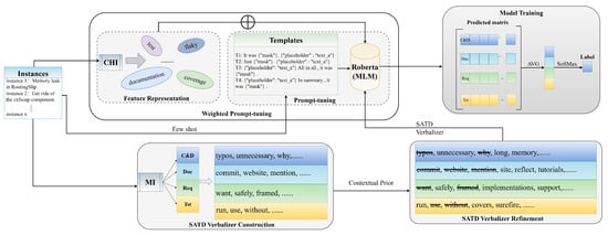 Figure 2 shows an overview of our method, including the following steps. In order to effectively extend the diversity of labels, we utilize the mutual information (MI) method to extract the features of each SATD type, which constructs the SATD verbalizer. Then, we refine the SATD verbalizer by contextual prior knowledge [34] to remove the low-frequency invalid words. Next, to improve the performance of the model, we obtain the weight of SATD features which employ the Chi-square (CHI) method to extract and obtain the predicted distribution of mask position on the SATD verbalizer by prompt tuning. Finally, we compute the average score of the SATD verbalizer in each type and map the predicted distribution into labels. Followed by employing a softmax function, we can accurately identify specific types of SATDs within issue-tracking systems.