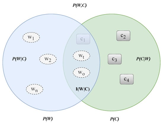 Figure 3 shows the mutual information of features and categories, where denotes the word set which is composed of unduplicated words of the corpus and contains n words. denotes the categories of SATD. represents the marginal probability distribution of words in the corpus. represents the marginal probability distribution of categories. denotes the joint probability distribution function of the word set and categories. From this figure, we can see that the mutual information is the overlap area between and . The formula for computing between features and labels are defined as follows: