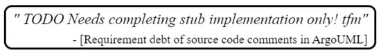 - Potdar, A.; Shihab, E. An exploratory study on self-admitted technical debt. In Proceedings of the 2014 IEEE International Conference on Software Maintenance and Evolution, Victoria, BC, Canada, 29 September–3 October 2014; pp. 91–100. [Google Scholar]