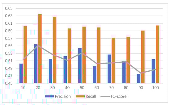 Figure 6 shows the results of each setup on the three indicators, where the vertical axis displays the performance values obtained for the three indicators, and the horizontal axis indicates the quantity of selected features. It can be observed from this figure that our method obtains optimal performance in all three indicators in which the number of selected features is 20. If NF is too small or too large, it can have a negative impact on our method. Too few features do not enhance our model performance, and too many features have too much noise, which negatively affects our model performance. Therefore, we chose the top 20 features as the feature words for expanding the label.