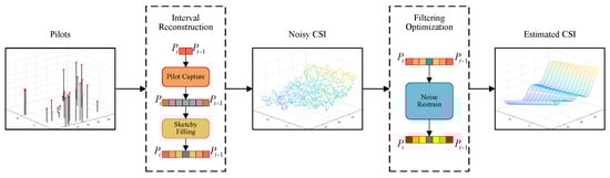 The overall process of channel estimation can be broken down into two stages—interval reconstruction and filtering optimization—as shown in Figure 2. and represent the pilot at t and time slot. The interval reconstruction obtains a complete approximation matrix based on the pilots, with the goal of expanding data size to construct an identity mapping for feature analysis []. Then the filtering optimization filters a noisy CSI to obtain a pure estimated CSI. The effect of rapidly time-varying UAV systems is mainly manifested in the channel changing over time [], so, in this paper, we choose a comb pattern as the pilot insert strategy. After obtaining the record of pilot positions, it is necessary to calculate a complete CSI through rough estimation, which is generally represented in the form of a channel frequency response (CFR) matrix. The UAV should be adopted with a rough estimation method that does not require prior knowledge. The LS is simple enough to implement and fast to operate [], so it is proper to use the LS for interpolation estimation. The process of LS calculating the CFR is shown in Formula (2)