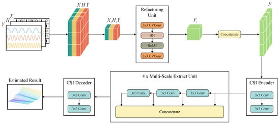The overall process of MSF is shown in Algorithm 2. The input will be split into a real part and an imaginary part and will then be encoded by the CSI encoder before being sent into the MSEU. After multi-scale processing, both global and local information can be captured, and the collaborative information from different receptive fields can be forcibly fused during the segmentation and concatenation. The output of MSEU is regarded as a filter matrix, and the noise will be effectively suppressed by adding it to the fulfilled CFR. Finally, the output feature will be considered the final estimation result.