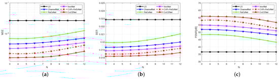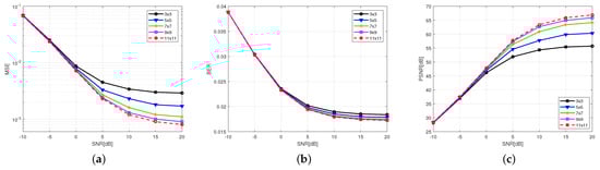 Comparison of the results of different sizes of hyper-estimation blocks under different SNR. (a) The MSE of each hyper−estimation block. (b) The BER of each hyper-estimation block. (c) The PSNR of each hyper-estimation block.