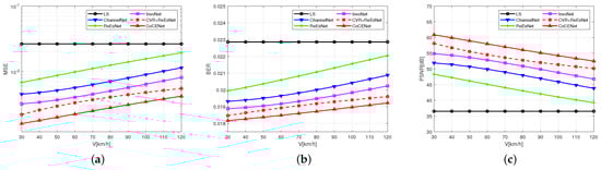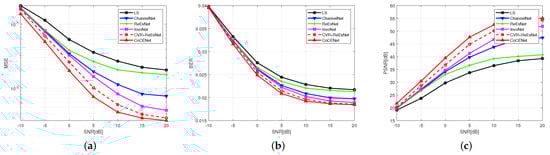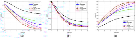 Comparison of the experiment results of various network models under different SNR with the maximum number of multi-paths set to 3 and the relative speed set to 120 km/h. (a) The MSE of each model. (b) The BER of each model. (c) The PSNR of each model.