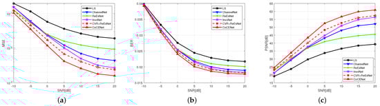 To demonstrate the ability of CoCENet to improve feature utilization and channel estimation performance by extracting collaborative features, this paper conducted comparative experiments on model performance under different signal-to-noise ratios using the same dataset. An LS algorithm was selected in the traditional algorithm field, and the ChannelNet, ReEsNet, InvoNet, and CVR + ReEsNet methods were selected in the deep learning field. The result are shown in Figure 7: