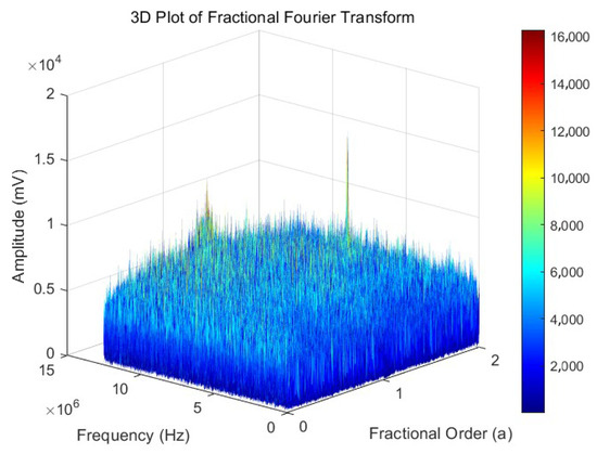 where F represents the Fourier transform operator; p denotes the fractional order of the Fourier transform; j is the imaginary unit; denotes the transformation coefficient; is the transformation angle; ; ; m denotes a discrete sampling point variable in the transformation domain; denotes the normalized width; and denotes the time duration of the processed signal. For simplicity, we denote as .