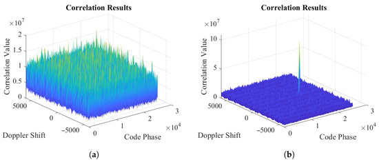 It can be observed that, prior to filtering, the receiver was unable to capture a distinct correlation peak, as shown in Figure 5a. However, after filtering, the receiver was able to successfully capture the correlation peak, as illustrated in Figure 5b. Therefore, it is evident that this method demonstrates effective filtering performance for LFM interference.