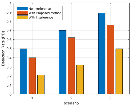 As shown in Figure 7, the experimental parameters for the Monte Carlo simulations were set as follows: the C/N0 of the useful GPS L1-C/A signal was configured to 40 dB-Hz, the JNR value of the sweeping interference was selected as 20 dB for the CAF evaluation, the sweeping period was established at 0.5 ms, and the coherent integration time was set to 2 ms. A total of 90,000 GNSS signal acquisition tests were conducted, to obtain the detection probability and false alarm probability under various signal reception environments. We observed that the receiver exhibited excellent acquisition performance in the absence of interference. However, the presence of LFM interference significantly diminished the probability of successfully capturing the signal compared to interference-free conditions. Furthermore, it can be noted that while the application of adaptive notch filtering technology enhances acquisition performance, and the interference mitigation capability of the Wigner–Ville distribution is somewhat superior, our proposed method demonstrated improved interference resilience compared to both adaptive notch filtering and the Wigner–Ville distribution.