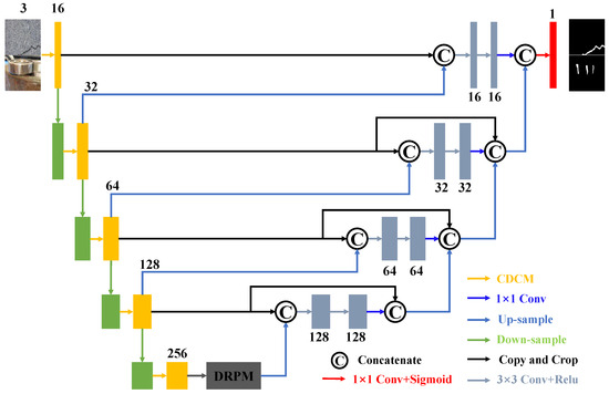 Next, the DRPM is added to the connection between the encoder and decoder for experimentation. With the DRPM incorporated, the model shows improved segmentation performance compared to the original U-Net. This enhancement is due to the hybrid dilated convolution in the DRPM, which effectively expands the receptive field. Visual results indicate that the DRPM not only enhances segmentation for larger, more prominent cracks by making edge structures clearer but also proves effective in identifying smaller, less obvious cracks.