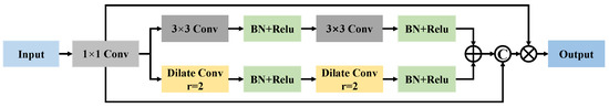 Inspired by the capabilities of the SK module, we propose a composite dual-channel module, as depicted in Figure 6. Specifically, the input image features are initially fed into a 1 × 1 convolution layer, which is used to size the channel and prepare the input for further processing. Following the initial processing in the CDCM, the feature diverges into two distinct branches. The first path is passed to two sequences of 3 × 3 convolution layers, and after each convolution layer, batch normalization (BN), and ReLU activation are used to normalize and add nonlinearities. This path focuses on extracting fine-grained details from the input, capturing localized information critical for high-resolution defect analysis. The second path is convolved by two expansions with an expansion rate r = 2, which helps capture a larger acceptance field. By using dilated convolutions, this path enhances the module’s capacity to detect larger structures or patterns, essential for analyzing surface defects that might spread over larger regions. After the above two steps, we concatenate the localization details of the first branch with the context information of the second branch. This integration ensures a more complete understanding of both fine and rough features, and it provides a robust feature representation for accurate defect detection. Unlike the SK module, the CDCM incorporates a residual structure that allows the model to retain the basic feature information of the previous layer, thus alleviating problems such as disappearing gradients and preserving low-level details. In addition, CDCM reduces computational complexity and potential overfitting by removing the fully connected layer. Finally, the outputs from the two paths are combined through multiplicative fusion, which effectively enhances the richness and depth of the final feature representation. By doing so, our CDCM achieves a more robust and discriminative feature map, which is especially valuable for tasks requiring precise defect localization and segmentation.