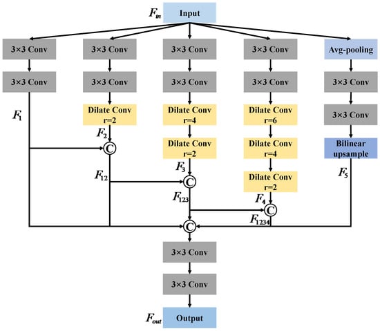 In practical applications, when a uniform dilation rate is used across continuous convolution layers, many pixels in the receptive field remain unutilized, resulting in voids. To mitigate this issue, varying dilation rates are applied at different convolution layers. This strategy allows for gradual expansion of the acceptance field, which preserves the necessary local details to capture complex image features, as shown in Figure 7. Since traditional convolution and pooling operations tend to lead to the loss of a large number of details in the image, and it is difficult to accurately recover these details with the classical up-sampling technique, the accuracy of semantic segmentation is limited. To address these challenges and push the boundaries of segmentation performance, we developed a dilated residual pyramid module at the bottom of the encoder, as depicted in Figure 8. The DRPM is designed with five separate branches, each dedicated to capturing feature information across various scales. Specifically, the first branch employs two consecutive 3 × 3 convolutions, without any extension, to obtain local information from the input feature map. The second to fourth branches add one dilated convolution (rate = 2), two dilated convolutions (rate = 4, 2), and three dilated convolutions (rate = 6, 4, 2) to two consecutive 3 × 3 convolutions. This design helps identify larger, more complex patterns and enhances semantic understanding. The last branch first performs an average pooling operation on the input feature map, then two 3 × 3 convolutions, followed by an up-sampling of the output using bilinear interpolation to match the size of the original feature map. The feature extraction in each branch can be formulated as follows: