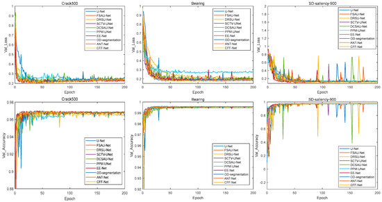 The loss and accuracy curves for the validation phases of all methods. The first column illustrates the results obtained on the Crack500 dataset, the second column displays the corresponding results for the Bearing dataset, and the last column shows the results for the SD-saliency-900 dataset.