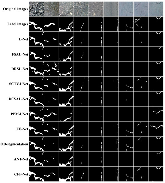 As shown in Figure 10, traditional U-Net struggles with images lacking clear features, interpreting both cracks and non-target areas predominantly as background. Similarly, models such as FSAU-Net, DRSU-Net, PPM-UNet, and ANT-UNet attempt to enhance feature analysis by modifying either the encoder structure or the connections within the network. However, these models encounter challenges in accurately identifying subtle cracks and images with minimal light and shadow contrast, particularly in columns 8 and 9. In contrast, models like SCTV-UNet, EE-Net, and OD-segmentation incorporate different types of connections into their architectures to address this issue more effectively. Our proposed CFF-Net combines advantageous elements from each of these models, implementing an adapted encoder structure with additional skip connections to better process the input data. In addition, the DRPM is applied to the output of the encoder, which facilitates a more complete integration of contextual information. In the final output stage, a cross-hierarchy feature fusion strategy is employed to accurately capture edge details. As shown in the last row of Figure 10, CFF-Net is able to process images better than other models, achieving a higher level of detail and recovery in crack detection.