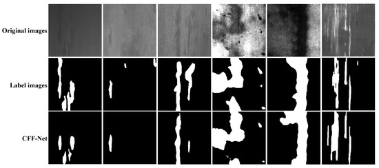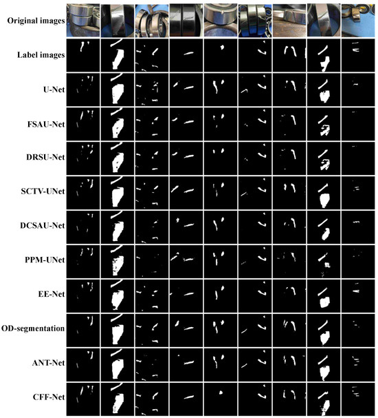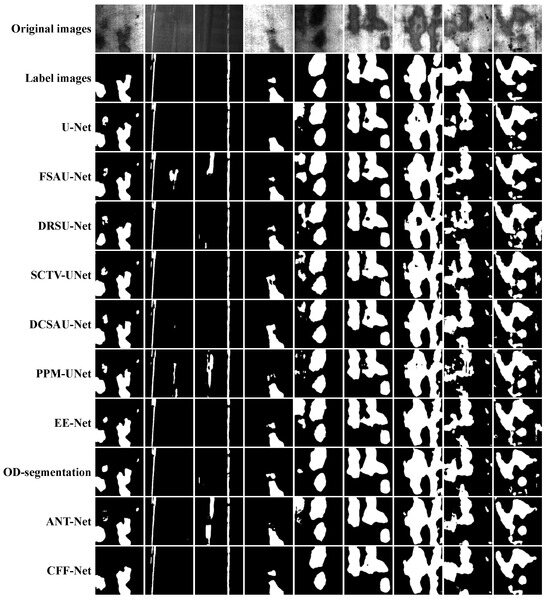 To demonstrate the superior performance of the proposed CFF-Net network, we began by conducting experiments on the Crack500 dataset. For comparison, we selected several state-of-the-art models developed in recent years, including U-Net [8], FSAU-Net [36], DRSU-Net [37], SCTV-UNet [38], DCSAU-Net [39], PPM-UNet [40], EE-Net [41], OD-segmentation [42], and ANT-Net [43]. In order to ensure accuracy and fairness in the experimental results, all models were trained under the same conditions, including the optimizer, learning rate, batch size, and number of epochs. The quantitative results of these experiments are summarized in Table 1, which details the performance of each model on the Crack500 dataset. The table reveals that, in addition to our proposed CFF-Net, both ANT-Net and DCSAU-Net demonstrate competitive performance. Among them, ANT-Net introduces an innovative clipping technique that combines random clipping with down-sampling, allowing the model to receive different resolutions during training. This approach not only provides varied receptive fields but also reduces image sizes, resulting in more efficient processing. Meanwhile, DCSAU-Net incorporates concepts inspired by the SK network, utilizing a multi-branch CSA block that leverages feature sets from multiple branches in combination with an attention mechanism. Each branch within the CSA block applies a different number of convolutions, enabling it to process varying receptive field sizes and generate comprehensive feature maps. In contrast, the remaining models exhibit weaker segmentation capabilities. This limitation may stem from their reduced effectiveness in handling noise and uneven lighting, which can cause the loss of global features and hinder the networks from learning useful information for accurate segmentation. However, CFF-Net showed the best performance in evaluation indexes, especially the Mcc and Dice, which reached 73.36% and 74.34%, respectively. Although the Jaccard index is only 59.53%, it is still 2.57% higher than the original U-Net. These results underscore the effectiveness of the composite dual-channel module, the dilated residual pyramid module, and the cross-hierarchy feature fusion strategy introduced in CFF-Net, which collectively enhance its ability to accurately segment surface defects.