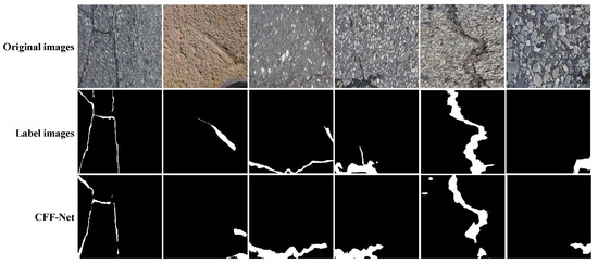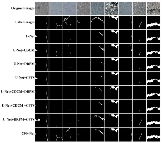 In this section, we provide an in-depth analysis of CFF-Net on the Crack500 dataset, in turn adding the CDCM, DRPM, and CFFS to the U-Net framework to evaluate the contribution of each component. After individual tests, we combined two modules at a time and eventually integrated all three modules. The quantitative results are shown in Table 4, while the visual output is shown in Figure 13.