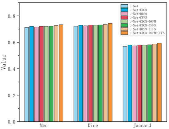 After the single-module experiment, we advanced to utilizing the modules in pairs. The results displayed in Table 4 indicate that combining the two modules significantly enhances the model’s performance, but there are still some problems. As illustrated in columns 2 and 3 of Figure 13, the CDCM module excels at delineating target regions in images that present considerable segmentation difficulties. In contrast, when the CDCM is paired with the DPRM and the CFFS, the model struggles to accurately identify the object, mistakenly categorizing it as part of the background. To address these shortcomings, we explored the efficacy of integrating all three modules simultaneously. Whether this can be obtained from the data results or from the visual results, such a model effect is the best. As shown in Figure 14, we converted the experimental data into a bar chart, and it can be seen that the performance was significantly improved gradually.