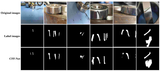 We further visualized the experimental results on the Bearing dataset, as shown in Figure 11, to illustrate the advantages of our proposed CFF-Net. The figure demonstrates that CFF-Net can accurately segment various defects, whether they are road cracks or surface scratches on objects. Compared to other models, CFF-Net’s segmentation results are more closely aligned with the original ground-truth labels. Although certain similar scratches, such as those in columns 8 and 9, are not perfectly differentiated, their overall shapes are still preserved, ensuring minimal impact on the model’s final output. This highlights CFF-Net’s ability to deliver precise segmentation even in challenging cases.