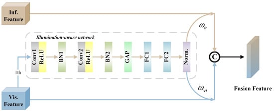 Under optimal illumination, visible light can capture features such as color, shape, and texture. Conversely, in low-light or night-time conditions, infrared images can highlight the thermal features of a target object by capturing its heat distribution and temperature differences. To address this, we propose the light-aware feature aggregation (LIFA) module, which optimizes the fusion process by considering illumination conditions. This allows the module to adapt to the illumination of the input video and to identify and exploit complementary and common features between different modalities. The structure of the LIFA module is shown in Figure 3. The initial visible light frame is input into the network with illumination perception capabilities. Features are further extracted through convolution, and the model is stabilized by a batch normalization layer to accelerate the training process. To achieve feature abstraction, fusion, and dimensionality reduction, two fully connected layers are utilized. Consequently, two weights denoted as and , which represent the illumination information, are obtained. The weights are derived using the softmax function. Despite being remarkably lightweight, this perceptual network possesses sufficient sensitivity to precisely detect illumination information and allocate weights for fusion.