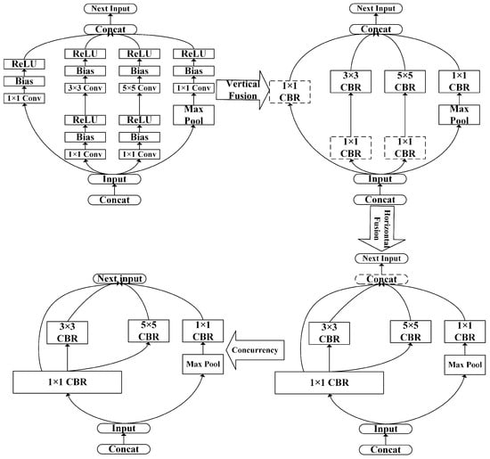 The precise operating process of NVIDIA TensorRT is depicted in Figure 5. Initially, the network architecture is vertically fused by integrating the convolution, bias, and rectified linear unit (ReLU) layers into a composite “CBR” layer. The network architecture is subsequently consolidated horizontally, whereby layers in the neural network that receive identical input tensors and execute identical operations are combined into a single layer. Ultimately, NVIDIA TensorRT facilitates the direct linkage of multiple output matrices and buffers, thus eliminating the need for a separate concatenation operation. This enables the output of the present layer to be immediately connected to the subsequent layer [].