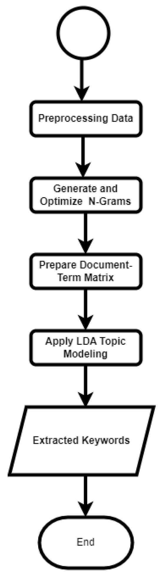 The keyword extraction model can analyze a large set of text documents and extract key ideas via topic modeling. Topic modeling is a specific type of document modeling technique used in NLP that represents documents of text as tokens found in the text itself. Topic modeling is used to derive abstract topics from documents and extract semantic meaning from a corpus of text. There are several topic modeling algorithms such as latent dialect allocation (LDA), transformer models such as BERT, hierarchical Dirichlet process, latent semantic analysis, and non-negative matrix factorization [22].