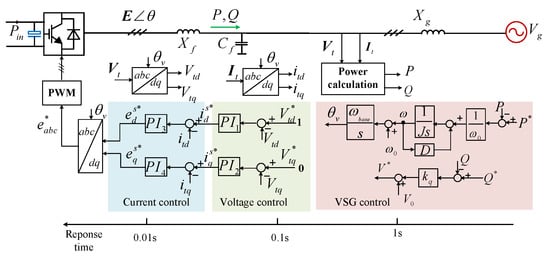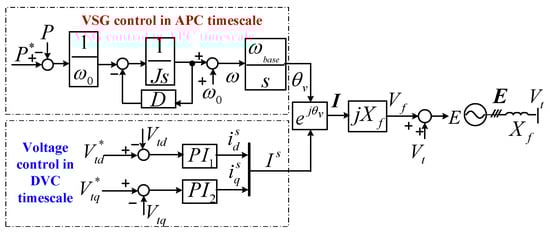 The response time of the VSG, voltage loop, and current loop is approximately 1 s, 0.1 s, and 0.01 s, respectively. For simplicity, only the APC and DVC timescales are considered, allowing currents to track their reference values instantaneously.
