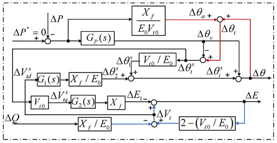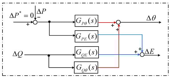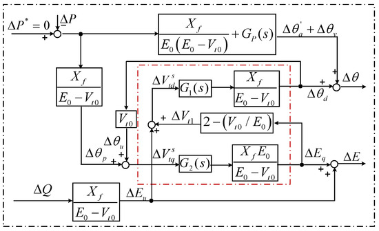 where and refer to the steady-state phase of the internal voltage and the terminal voltage in the VSG-synchronized reference frame, they are usually less than 10 degrees under small perturbations. That is, , , and , . Substituting the results into (31) and (32), and can further be represented as