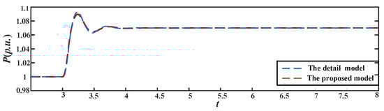 The proposed model in the APC and DVC timescale is verified by comparing it with the detailed component model in MATLAB/Simulink. Assume that a small disturbance (0.01 p.u.) in active power occurs at 3 s. Figure 8 shows the responses of the active power output P of the proposed and detailed model under the parameters listed in Appendix A.2. The results indicate that the proposed model without the current loop can match the detailed model in the APC and DVC timescales. Table 1 presents the comparison results between the proposed and detailed models at different operating points, representing the closeness in values for and . Our focus is on and in the APC and DVC timescales, and consequently, the proposed model can be applied to analyze small-signal stability problems.