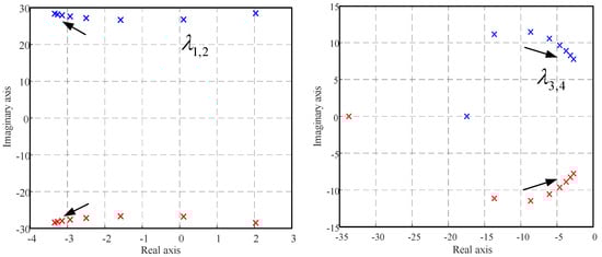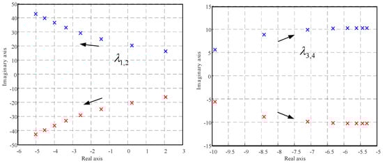 Considering the integral parameter with , , it is observed that the real parts of transition from 2.06 to −5.01 as increases, while those of shift from −9.90 to −5.30, as shown in Table 3. The damping ratio (DR) of rises from −0.09 to 0.11, whereas that of declines from 0.57 to 0.45. This suggests that significantly affects the APC and DVC timescales, with the system exhibiting instability at . Furthermore, the root locus diagrams for and are demonstrated in Figure 10.