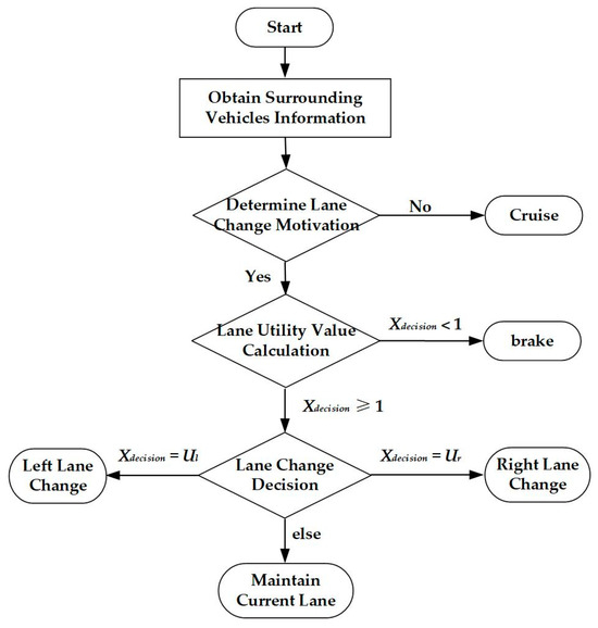 Currently, lane-change decision-making methodologies are primarily categorized into two approaches: machine learning-based and rule-based techniques [6,7]. Zhang et al. [8] optimized the vehicle lane-changing decision-making process using a deep Q-network (DQN), refining decisions through interactions with the environment. However, the DQN approach requires extensive training time and significant computational resources, making it difficult to meet real-time operational demands. Liao et al. [9] developed a decision model leveraging deep reinforcement learning, which learns optimal decisions through environmental interactions but necessitates a large amount of high-quality training data for better generalization. Building on cumulative prospect theory, Long et al. [10] introduced a model that evaluates drivers’ risk preferences to enhance safety, but individual differences may affect its applicability. Qu et al. [11] proposed a lane-changing decision model based on evolutionary game theory, which reduces the risk of conflicts and collisions during lane changes. However, this model assumes full information sharing among vehicles, which is difficult to achieve in reality.