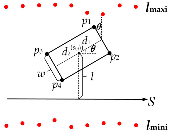 Similarly, when the vehicle is close to a right-front obstacle, the maximum value of in is recorded as , and the corner points of the vehicle should meet the constraints as follows: