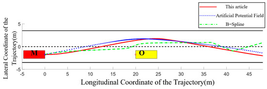 During the simulation, which is set for 15 s, real-time trajectory planning is executed. Given that the speed of the vehicle O1 in front of vehicle M is less than M’s speed, and the relative distance and speed do not meet safe driving conditions, vehicle M generates a lane change motivation. Since vehicle O2 in the left lane is slower than vehicle M, it poses a risk to safe lane changing. However, vehicle O3 in the right lane matches vehicle M’s speed, maintaining a stable relative distance. Consequently, the utility value for changing into the right lane is deemed the highest, leading to the decision to execute the lane change to the right. The simulation results depicting the lane change scenario with obstructing vehicles on both sides are shown in Figure 13.
