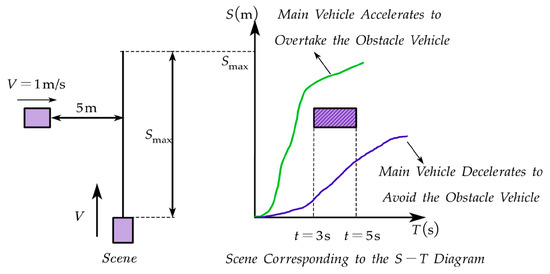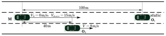 At the initial moment, the vehicle (M vehicle) begins with an initial speed of 0 m/s, accelerates, and aims for an expected speed of 15 m/s. A stationary vehicle O1 is positioned 100 m ahead in the same lane, while an environmental vehicle O2 is located 40 m in front of the right lane, traveling at a constant speed of 8 m/s. The surrounding obstacles are depicted in Figure 10.
