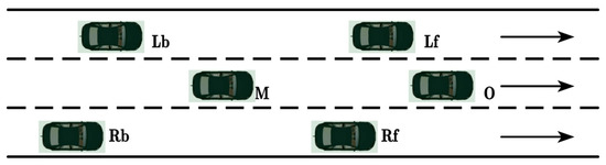 The research scene of this paper is a typical traffic scenario in highway where intelligent vehicles operate on straight multi-lane road sections [27]. Given the numerous influencing factors involved in lane changes, the active lane change scenario is simplified. The vehicle lane change scene is illustrated in Figure 7, which primarily considers the left and right adjacent lanes as potential target lanes for the vehicle’s lane change. In the figure, vehicle is the subject of study. Obstacle vehicle and vehicle are in the same lane, with driving in front of . Vehicles and are in the left and right adjacent lanes of vehicle , also driving in front. Vehicles and are in the same adjacent lanes but driving behind vehicle . It is assumed that the surrounding vehicles maintain uniform speeds in their respective lanes without changing lanes. Additionally, the vehicle’s perception system can integrate real-time dynamic information about surrounding vehicles, the vehicle’s status, and road conditions, enabling comprehensive and accurate traffic data acquisition.