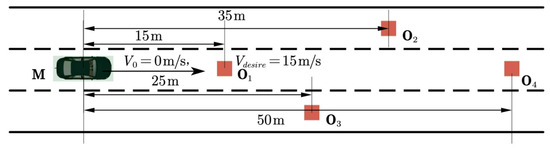 At the initial moment, the vehicle (M vehicle) starts with an initial speed of 0 m/s and aims to reach an expected speed of 15 m/s. There are four static obstacles O1, O2, O3, and O4 (such as roadblocks and malfunctioning vehicles) located 15 m and 50 m in front of the current lane, with a longitudinal distance of 35 m from the left lane and 25 m from the right lane of the adjacent lane. The static obstacle lane change conditions are illustrated in Figure 8.