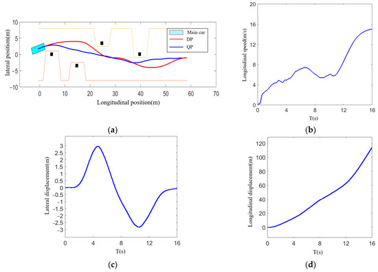 Real-time trajectory planning is conducted, and the simulation duration is set to 16 s. When the vehicle detects that the distance between itself and the obstacle in front does not meet safe driving conditions, it generates lane change motivation. Around t = 4 s, the driving distance in the left lane is greater than that in the right lane, prompting a left lane change. By t = 8 s, the driving distance in the right lane exceeds that of the left lane, leading to a right lane change decision. The trajectory planning is executed based on the vehicle’s own information and the surrounding environmental data. The simulation results under static obstacles conditions are depicted in Figure 9.