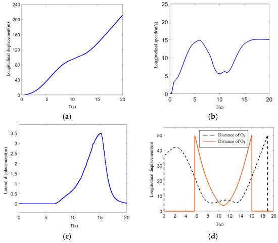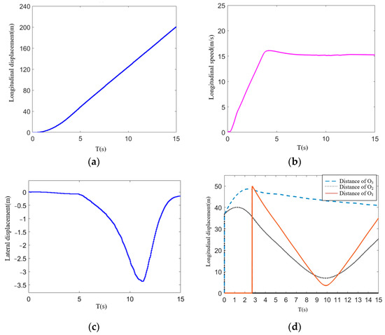 Simulation results for single lane with obstacle vehicles: (a) lateral displacement; (b) longitudinal speed; (c) longitudinal displacement; (d) longitudinal distance to surrounding vehicles.