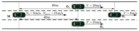 At the initial time, vehicle M starts from a standstill (0 m/s) and accelerates toward an expected speed of 15 m/s. In front of vehicle M, there is a vehicle O1 traveling straight at 8 m/s, positioned 60 m ahead. In the adjacent lanes, vehicles O2 and O3 are traveling straight at 10 m/s and 15 m/s, respectively, located 40 m ahead, as illustrated in Figure 12.