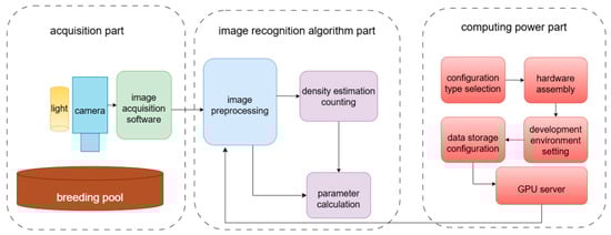 Finally, the system stores and analyzes the collected image data and recognition results in the “data storage configuration” and “parameter calculation” stages. The data storage configuration must consider efficient storage and retrieval of extensive image data, while simultaneously analyzing and processing the acquired data to extract critical information related to shrimp count.