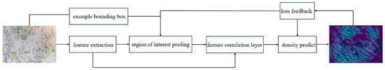 This module utilizes correlation maps between sample and image features to estimate density, employing multiple correlation maps generated by scaling sample features at different scales and combining them with image features. Given an input image , the feature map obtained after processing through ResNet-50 is denoted as , with dimensions , where represents the height, denotes the width, and indicates the number of channels. The core of the density estimation module employs a CNN to transform the feature map into a density map . Each pixel value in the density map represents the density of shrimp larvae at that specific location. This process can be mathematically expressed as follows: