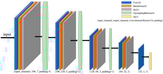 The feature extraction module is based on the first four layers of ResNet-50 [18], with the parameters of these convolutional layers kept fixed to ensure the extraction of multi-scale convolutional features from the input images. By leveraging convolutional feature maps and pooling in conjunction with regions of interest (ROI), the module extracts morphological and local features of the shrimp from a limited number of annotated samples. These features are subsequently integrated with the density estimation module to predict the target count. The primary optimization focuses on enhancing the density prediction module, which incorporates BatchNorm2d [19] for output standardization, thereby reducing activation value distribution bias, mitigating overfitting risks, and accelerating training speed. Furthermore, instead of using ReLU as the final activation function, SiLU [20], a novel activation function that allows small negative values to pass through for better gradient propagation, is employed due to its proven effectiveness in this deep-learning task. The network structure diagram illustrating the density prediction module can be seen in Figure 4.