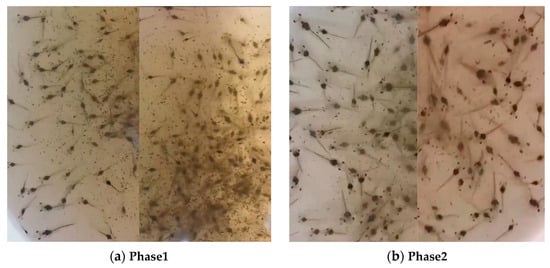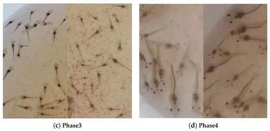 To systematically evaluate the growth conditions of the shrimp, their growth cycle was divided into four distinct stages with a one-week interval between each stage. These growth stages are defined as follows: the first stage lasts for 10 to 17 days; the second stage spans 18 to 24 days; the third stage covers 25 to 31 days; and finally, the fourth stage extends from day 32 to day 38. Throughout these growth stages, a series of images were captured at a fixed height while adjusting the light intensity of the image sensor, enabling detailed analysis of shrimp characteristics at different developmental stages. Representative images of shrimp larvae from each stage are presented in Figure 5, along with corresponding quantity ranges provided in Table 1.