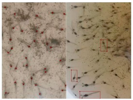 Example of shrimp larvae image annotation. On the left side, all shrimp larvae were marked with dots, and on the right side, some shrimp larvae were marked with boxes. Point annotation is mainly used for ground truth, and the bounding box annotation is used for predicting results.