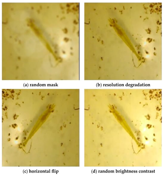 Specifically, the random mask technique involves randomly blurring a portion of the image to simulate partial occlusion conditions, enhancing the model’s adaptability to occluded scenarios. Resolution degradation aims to simulate low-resolution image recognition and test the model’s robustness when information is reduced. Horizontal flipping mirrors the image, increasing the model’s ability to recognize shrimp larvae in different orientations. Random brightness and contrast adjustments modify the image’s brightness and contrast, simulating varying lighting conditions during image acquisition and enhancing the model’s recognition accuracy in fluctuating light environments.