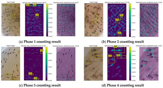 The data presented in Table 3 demonstrate the robust adaptability and high accuracy of the small-scale labeling density estimation counting method across various growth stages of shrimp larvae. Although relatively higher error levels were observed during the early stage when the shrimp population was small and abundant, the performance level significantly improved as the shrimp matured. These findings suggest that the small-scale labeling density estimation method holds great promise as a counting technique, particularly suitable for shrimp farming scenarios with limited annotated data.