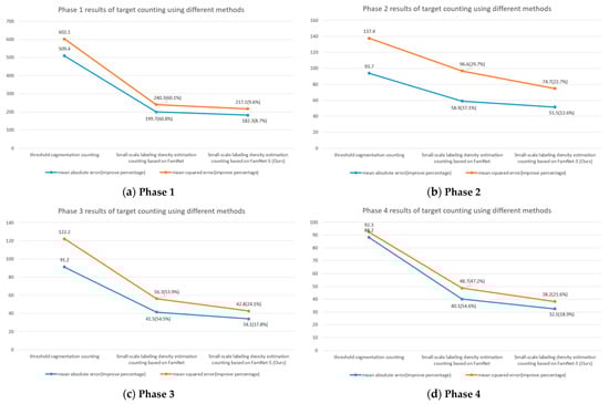 In the third stage, as the individual characteristics of the shrimp became more pronounced, further optimization was achieved in counting high-density shrimp populations using the method, resulting in a decrease in MAE to 34.1 and MSE to 42.8. Ultimately, during the size marking and transfer stage of shrimp larvae where their size and numbers decreased, both MAE and MSE were further reduced to 32.5 and 38.2, respectively. The small-scale labeling density estimation method exhibited superior accuracy compared to the threshold segmentation counting method, demonstrating its stability and reliability across different growth stages and varying densities of shrimp.