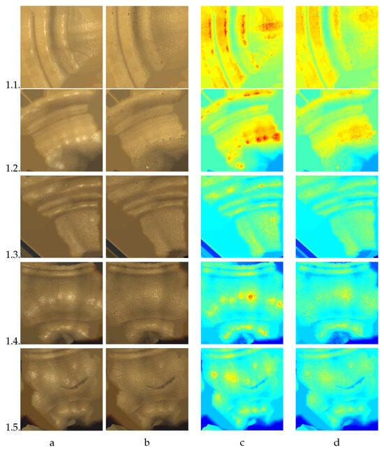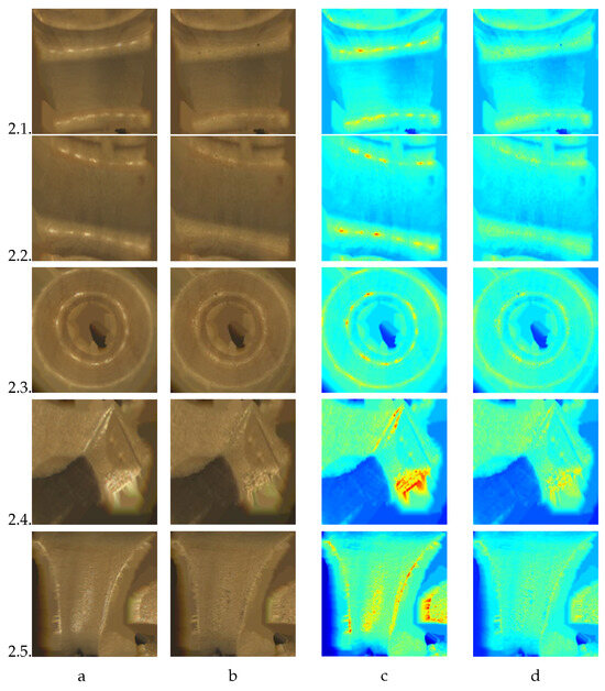 Using 3D scanning to create target object models can result in digital models carrying reflections from the scanning process, particularly specular reflections. These unrealistic reflections can negatively impact the subsequent use of these objects in virtual environments, as they can interfere with how the objects are represented in different scenes. Therefore, once the model creation is completed, the first priority is to remove specular reflections from the model’s texture, which requires balancing the efficiency and effectiveness of the algorithm. From Table 7, it can be seen that the specular highlight removal method used in this study is effective to some extent. Higher VIF values appear in image pairs 1.4 (0.8430) and 2.3 (0.8441), indicating that these image pairs retain more visual information after highlight removal. However, there are still some shortcomings in certain texture areas, such as when the highlight areas are close to other areas with similar brightness, making it difficult to remove highlights effectively, and when the colour of the highlighted portion has been bleached, making it hard to fully restore the original colour. Overall, the SSIM values are high, indicating good structural similarity after highlight removal, particularly in image pairs 2.2 (0.9983) and 2.1 (0.9982). The low MSE values in image pairs 2.1 (14.4308) and 2.3 (16.4571) indicate smaller errors between these image pairs, showing good highlight removal effectiveness. Image pairs 2.1 (36.5379) and 2.3 (35.9673) have a high PSNR, indicating lower noise and higher image quality after highlight removal. In general, the high SSIM values indicate good structural similarity, while the MSE and PSNR values show varying levels of error and noise between the image pairs. These metrics and Figure 5 and Figure 6 indicate that the highlight removal technique used in this study can, to some extent, restore the texture details of the scanned objects.