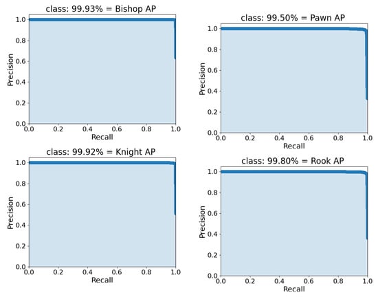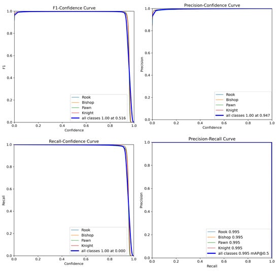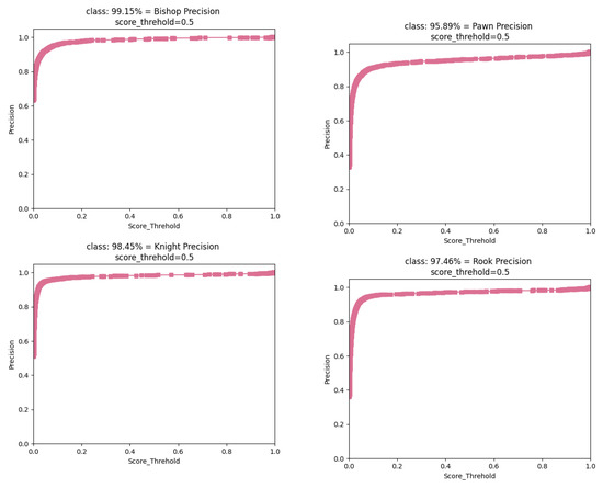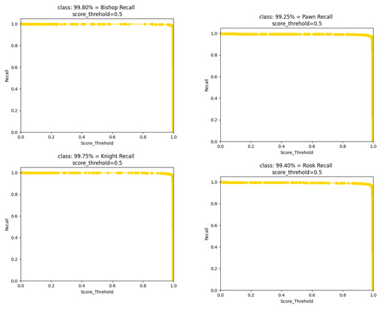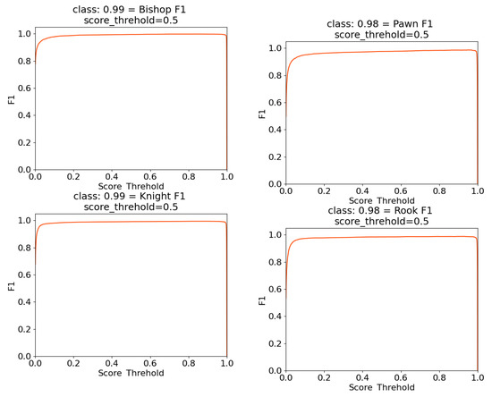 In Figure 17, Figure 18, Figure 19 and Figure 20, the F1 score, precision, and recall versus score threshold (=0.5), and the precision–recall curve for the classification model are presented. As can be seen from these four figures, the different classifications (rook, bishop, pawn, and knight) perform well on all metrics.
