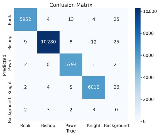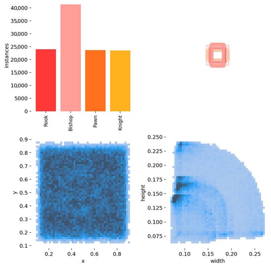 As shown in Figure 13, the confusion matrix demonstrates the classification results of the model on the test set. These four charts display different characteristics of the dataset: the bar chart in the top left shows the number of instances for each category (rook, bishop, pawn, knight); the heat map in the bottom left illustrates the x and y position distribution of the bounding boxes within the images; the heat map in the bottom right presents the width and height distribution of the bounding boxes; and the small chart in the top right displays the overlap of bounding boxes, reflecting the layout of different categories within the images. As can be seen from the figure, the classification between different categories is better and most of the instances are correctly classified. The bishop category was the most accurately classified, with fewer instances misclassified. Overall, the model has a high classification accuracy across categories, further illustrating the usability and effectiveness of the synthetic dataset. Figure 14 shows the distribution of instances of different categories in the synthetic dataset and the corresponding heat map. The histogram shows that the bishop category has the most instances at about 40,000, while rook, pawn, and knight have a relatively balanced number of instances, all at about 25,000. Additionally, it is important to clarify that these numbers represent the frequency of instances within the segmented (labelled) training dataset. The heat map below shows the distribution of the x and y positions of the objects in the dataset as well as the width and height distribution. It can be seen that the x and y distribution of the objects is relatively uniform, while the width–height distribution is concentrated in a specific range, indicating that the dataset has good uniformity and representativeness in the generation process. The number of bishop images is higher because their complex features require more examples to improve the final accuracy.